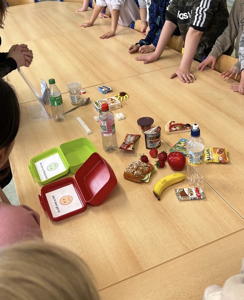 Die einzelnen Klassen nahmen nacheinander an einem kurzen Theorie-Input teil. Dabei wurde kindgerecht vermittelt, wie viel Zucker in verschiedenen Lebensmitteln steckt und worauf es bei einer gesunden Brotdose ankommt. Die Kinder zeigten großes Interesse und waren überrascht, wie viel Zucker sich in manchen Produkten verbirgt.